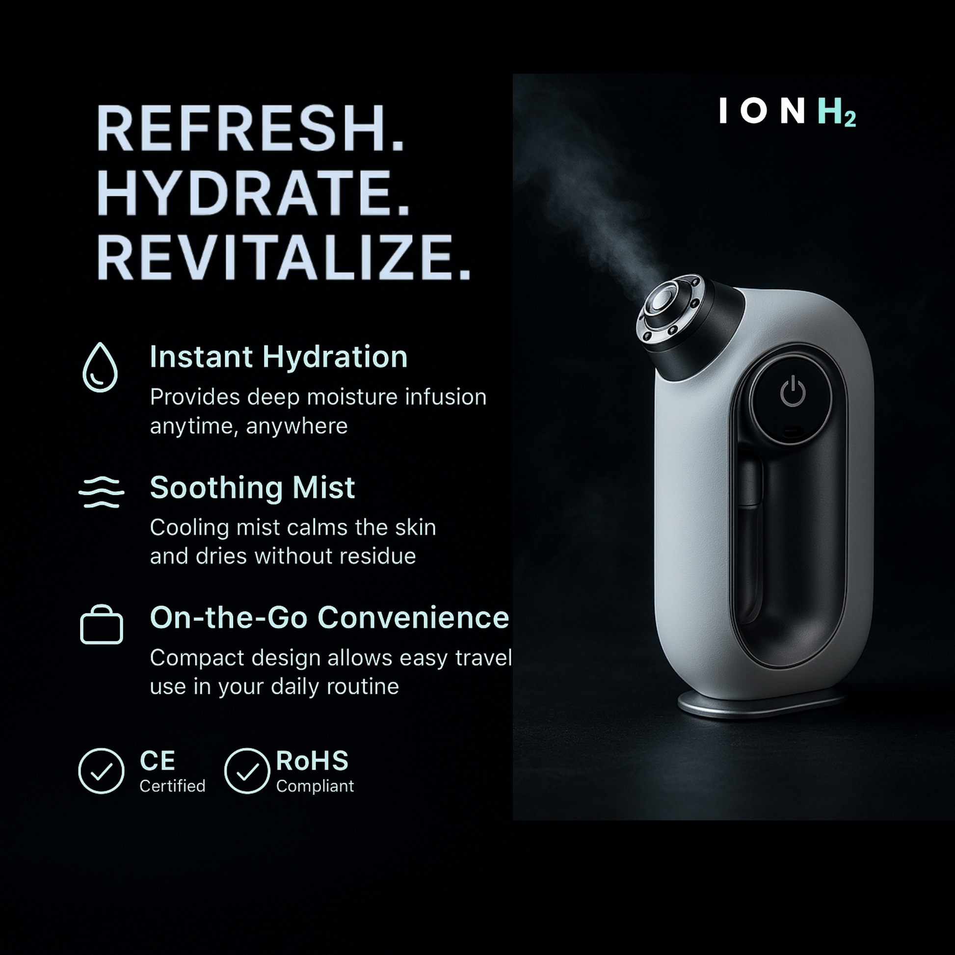 Refresh your skin anytime, anywhere with the IonH2™ Nano Mist Sprayer. This portable facial hydration device creates ultra-fine mist particles that penetrate deep into the skin, restoring moisture, soothing dryness, and giving you that fresh, radiant glow on the go. Perfect for travel, office, or post-workout care. Features: Ultra-Fine Nano Mist – Deep hydration for face and skin. Portable & Pocket-Sized – Sleek design fits in handbags, backpacks, or pockets....